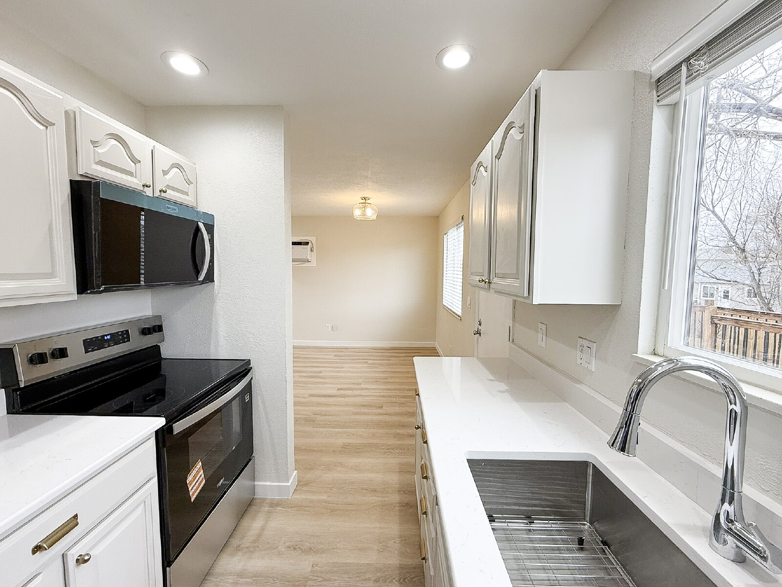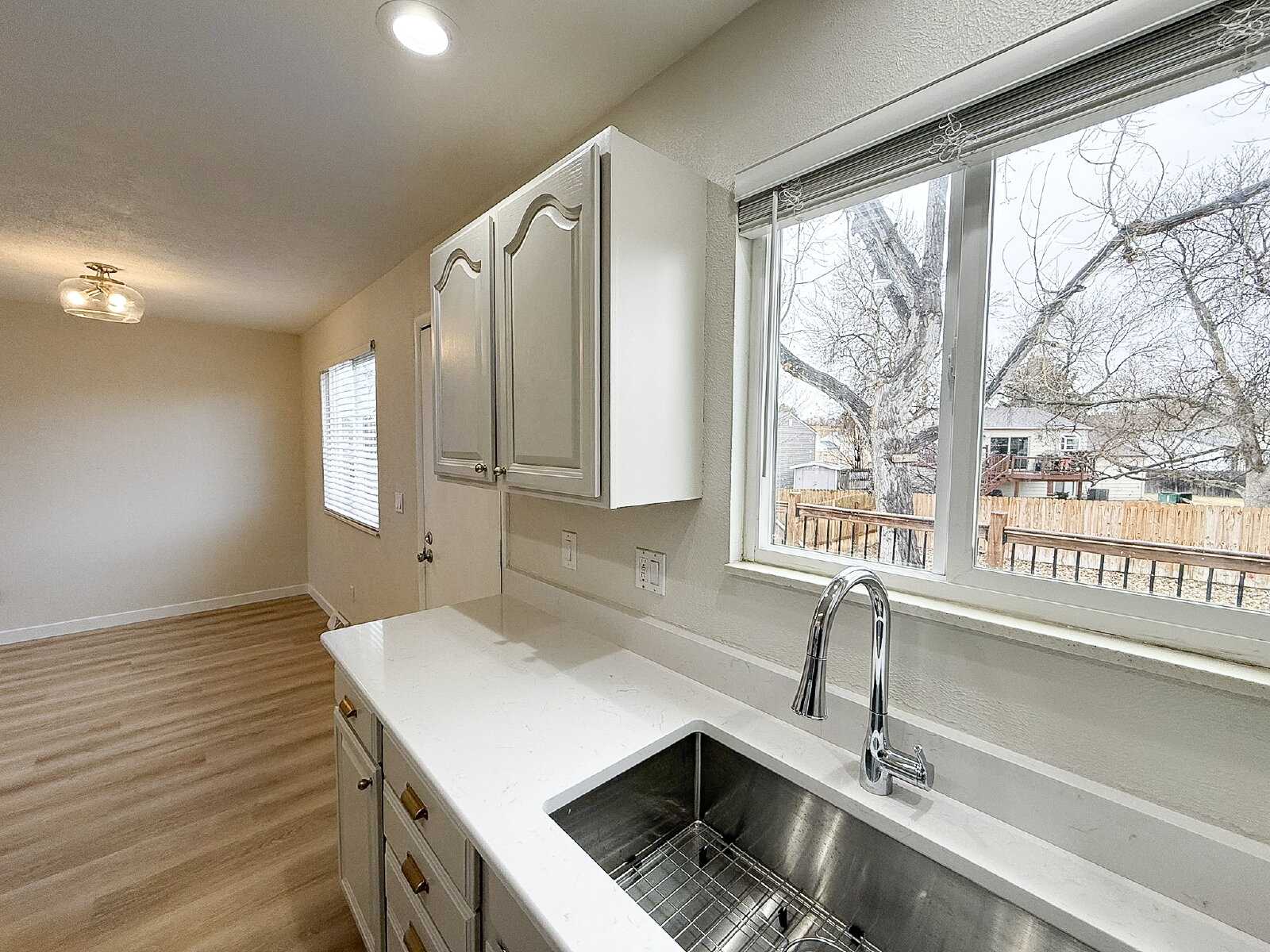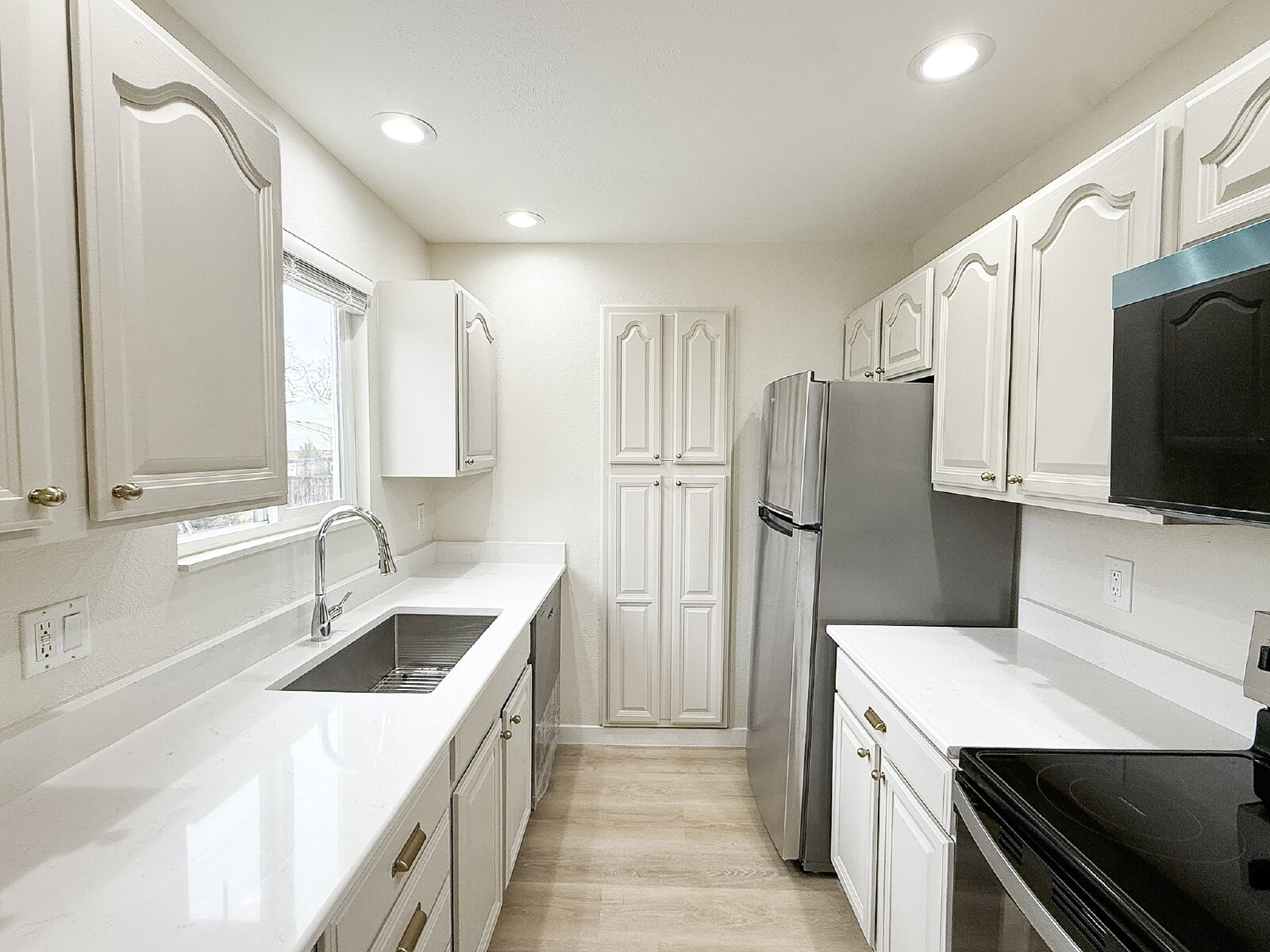 This home has been fully refreshed with clean, modern finishes throughout. New flooring runs across both levels, complemented by fresh paint and updated lighting that gives the space a bright, open feel.