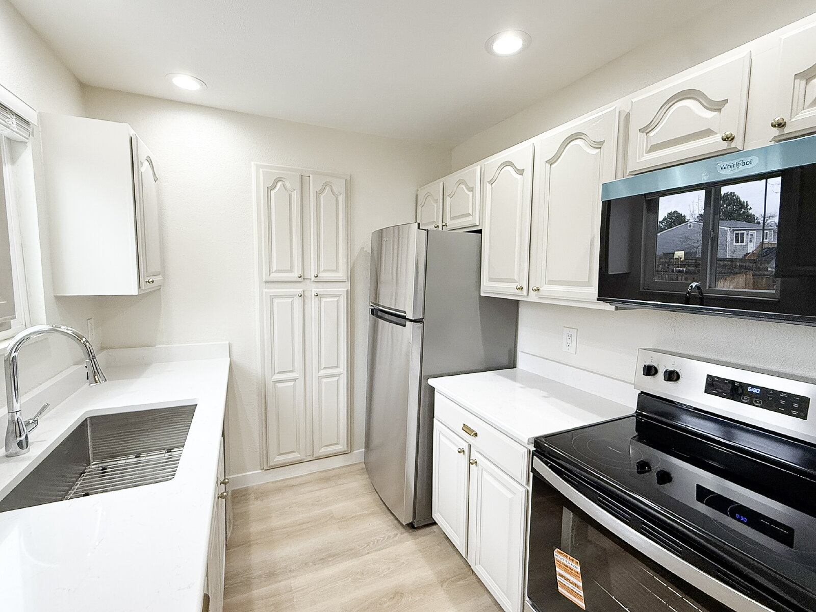 The main level offers a spacious living area with recessed lighting and great natural light — a comfortable place to unwind at the end of the day. The kitchen has been updated with quartz countertops, stainless steel appliances, and refreshed cabinetry, offering both function and clean design. A convenient half bathroom and main-level laundry room round out the upper floor.