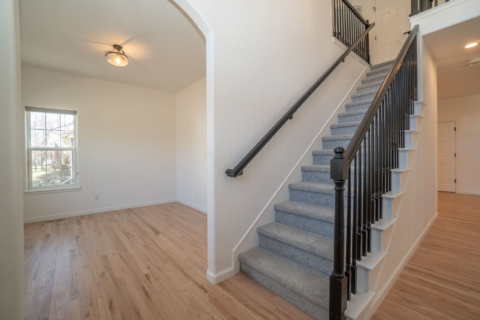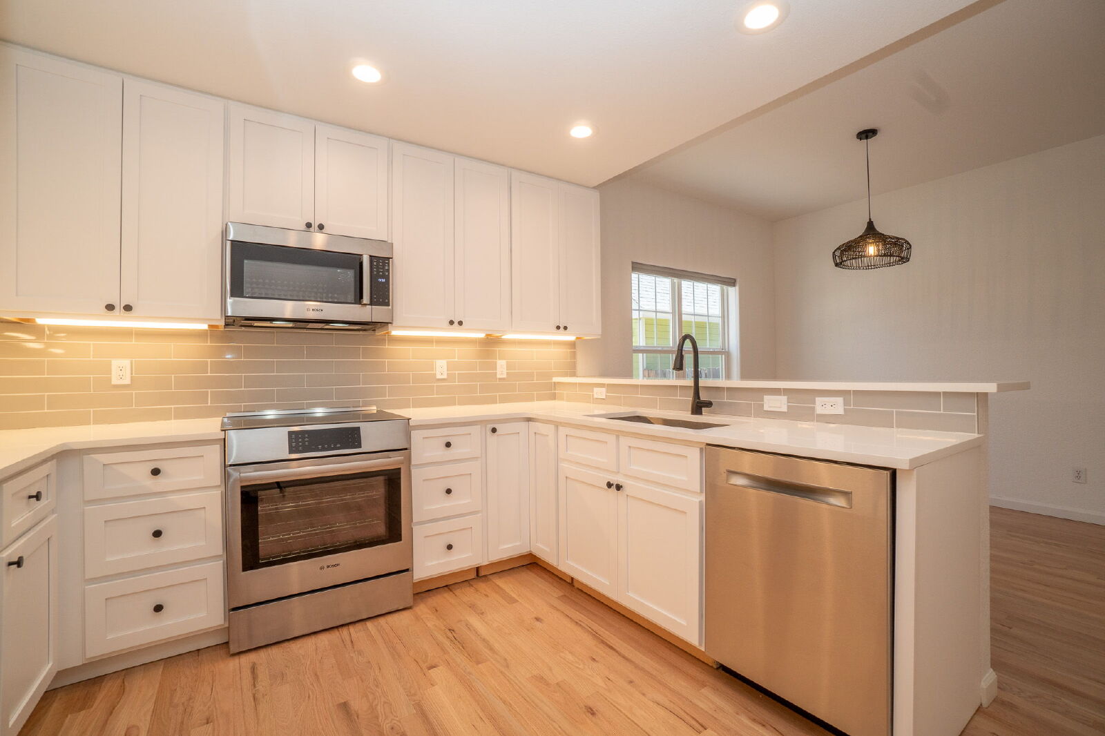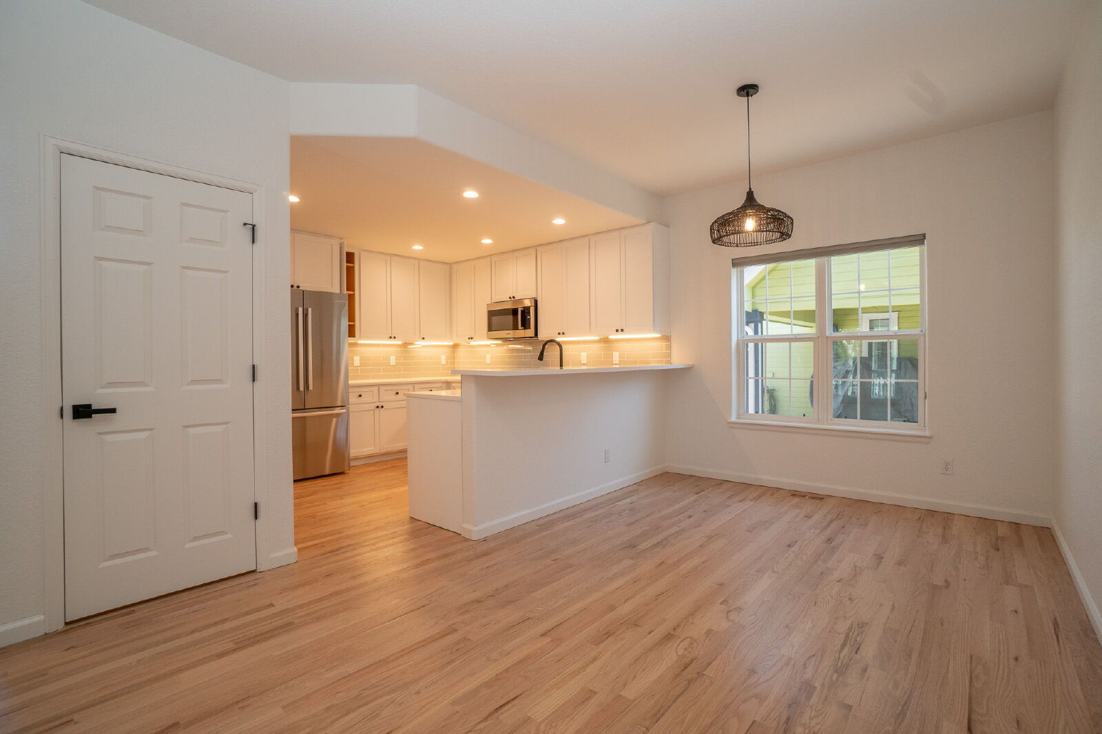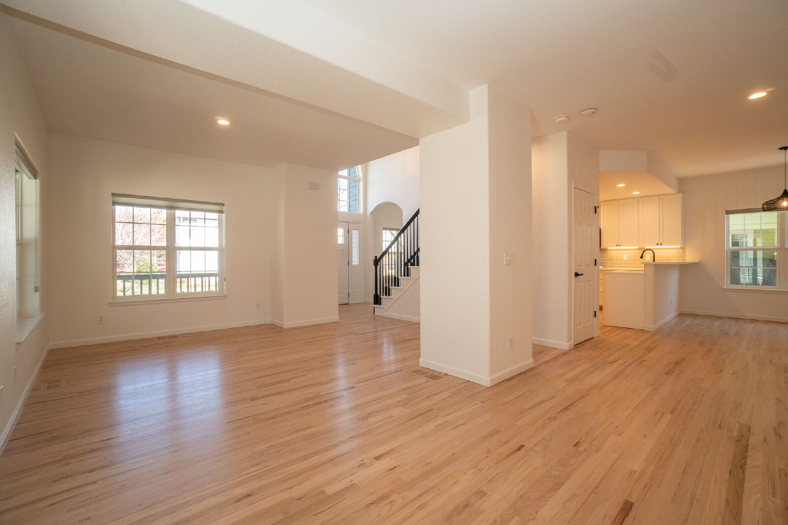 The open-concept main level is filled with natural light and features a seamless flow between the living room, dining area, and kitchen—perfect for both everyday living and entertaining.