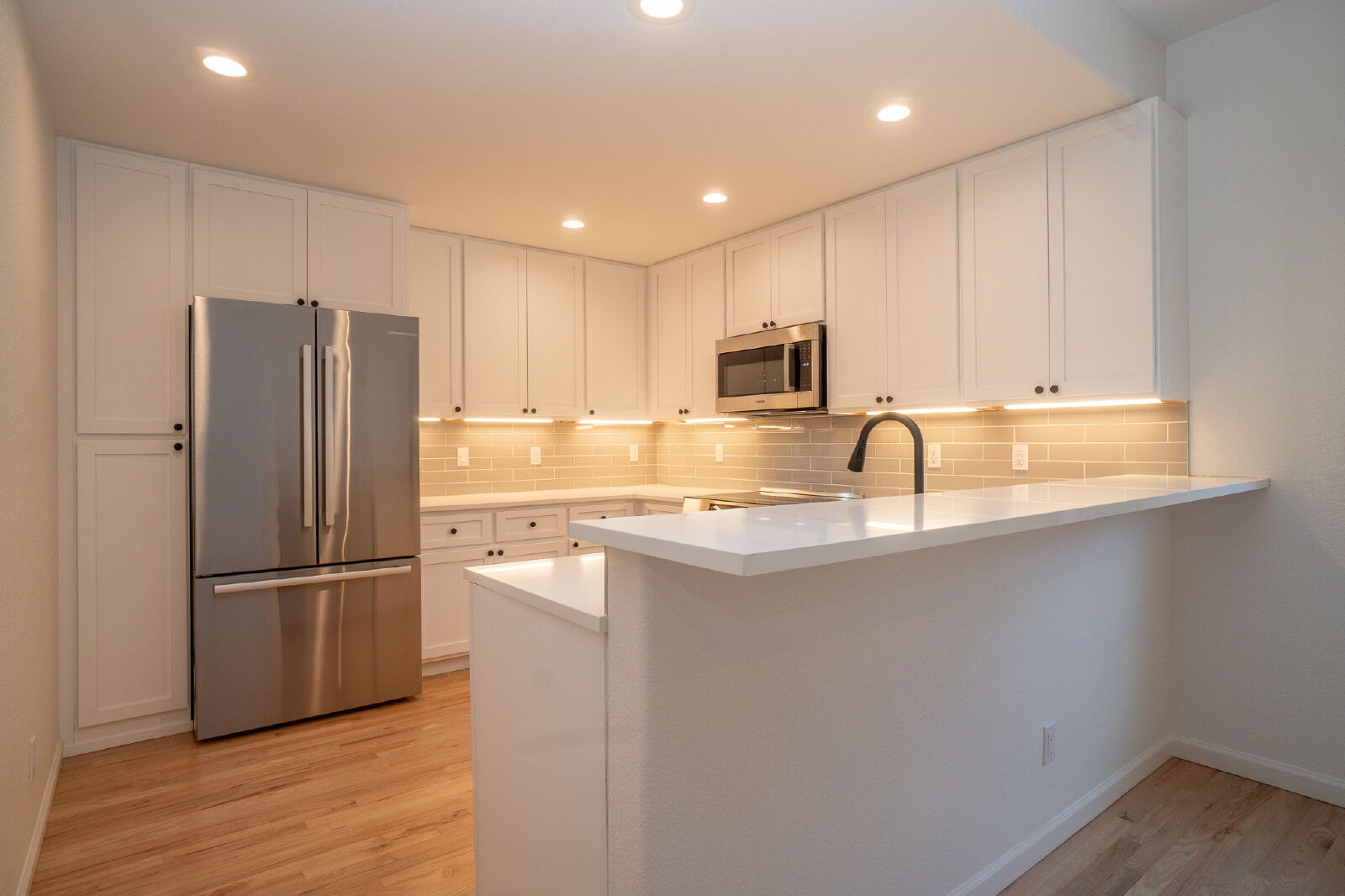 The updated kitchen showcases quartz countertops, stainless steel appliances, and abundant cabinetry, while a convenient half bathroom serves guests with ease.